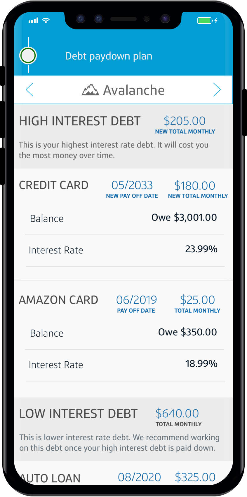 Before we could give financial advice, we needed to better understand Olivia’s debt picture. That would allow us to frame our reduction guidance based on what worked for the customer, and how to best support her debt journey. By providing a clear categorization of high and low interest debt, we reframed how Olivia currently thinks about her debt.