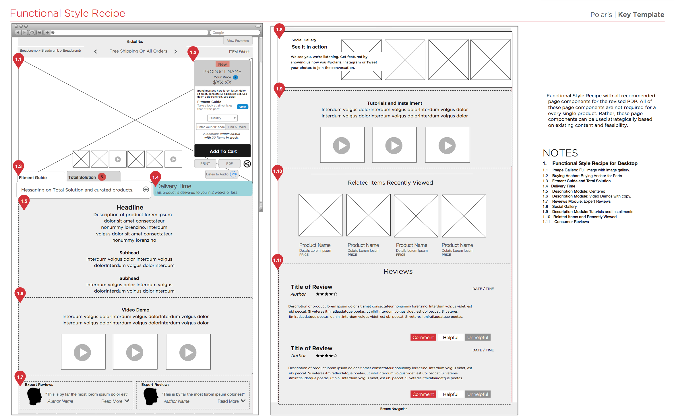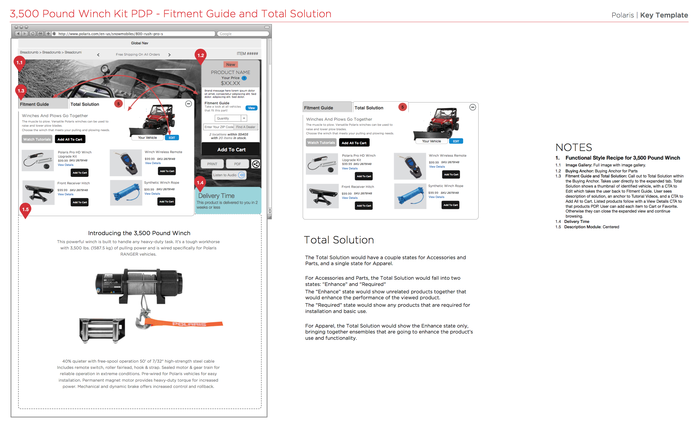 The following are showing related components applied to the recipe for one of those Templates, the Functional Style. A mockup of the 3,500 pound winch kit page with my recommendation on behavior, functionality and user experience. This is only a portion of the pattern library. Here is a simplified version of the mockup using content from the current PDP. A complete list of template components and related functionality.
